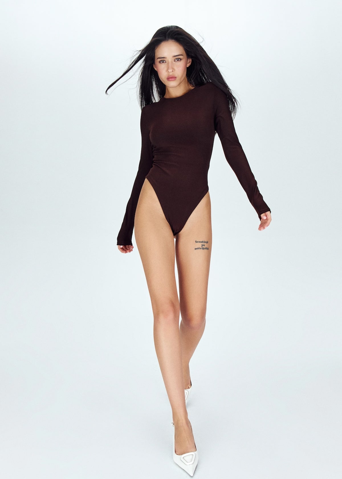 Mesh bandeau bodysuit with shoulder draping in Chocolate