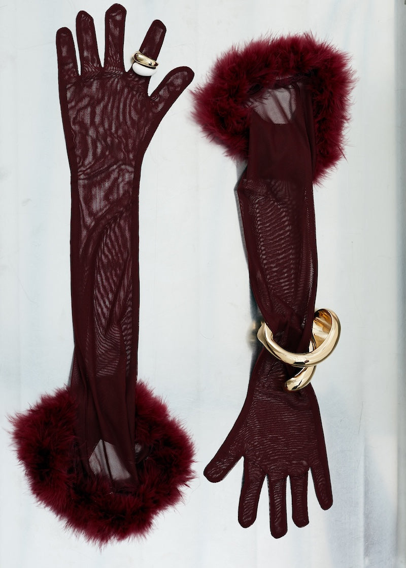 Gloves with feathers in Burgundy
