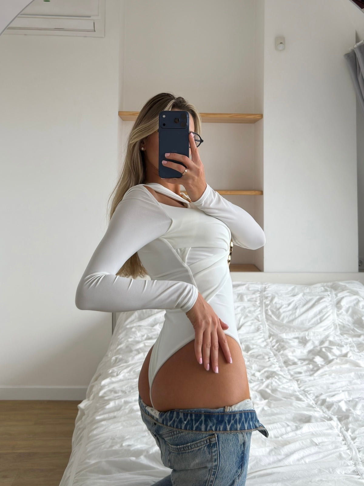 Mesh bandeau bodysuit with shoulder draping in Light Blue