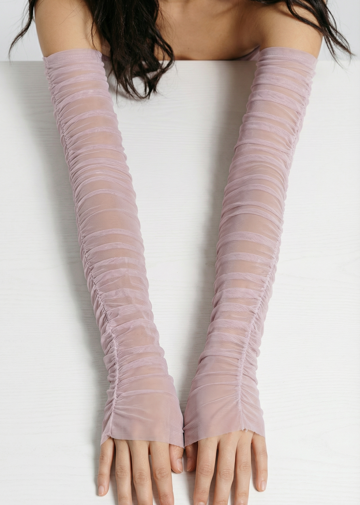 Mesh bandeau bodysuit with shoulder draping in Powder pink