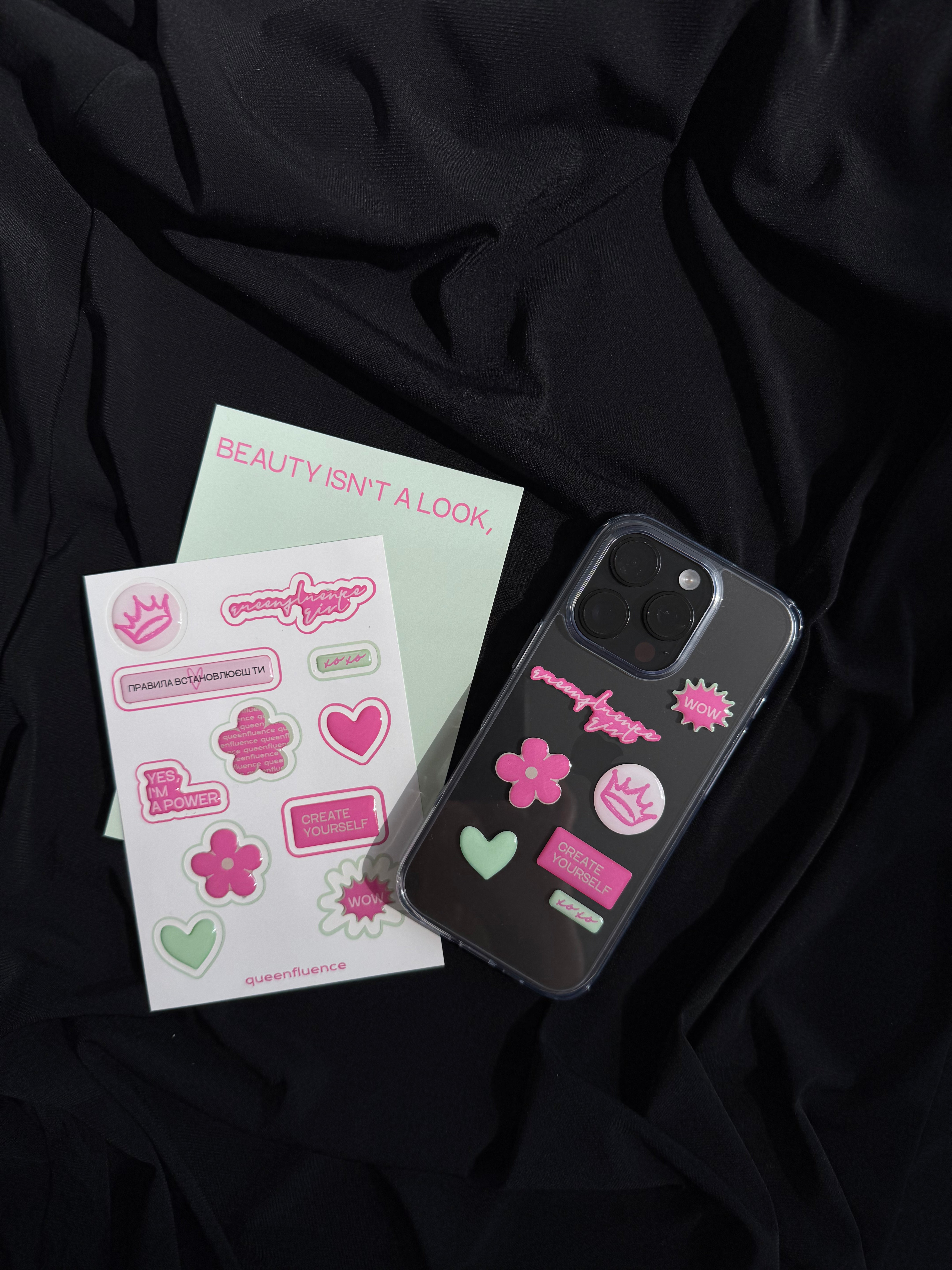 Add a touch of individuality to your phone with a set of 3D volume stickers from Queenfluence! Each sticker is designed with the brand's aesthetics in mind, featuring stylish details that highlight your uniqueness. The high-quality materials ensure durability and vibrant colors that last. Create a unique look for your phone and express your style with Queenfluence!