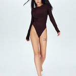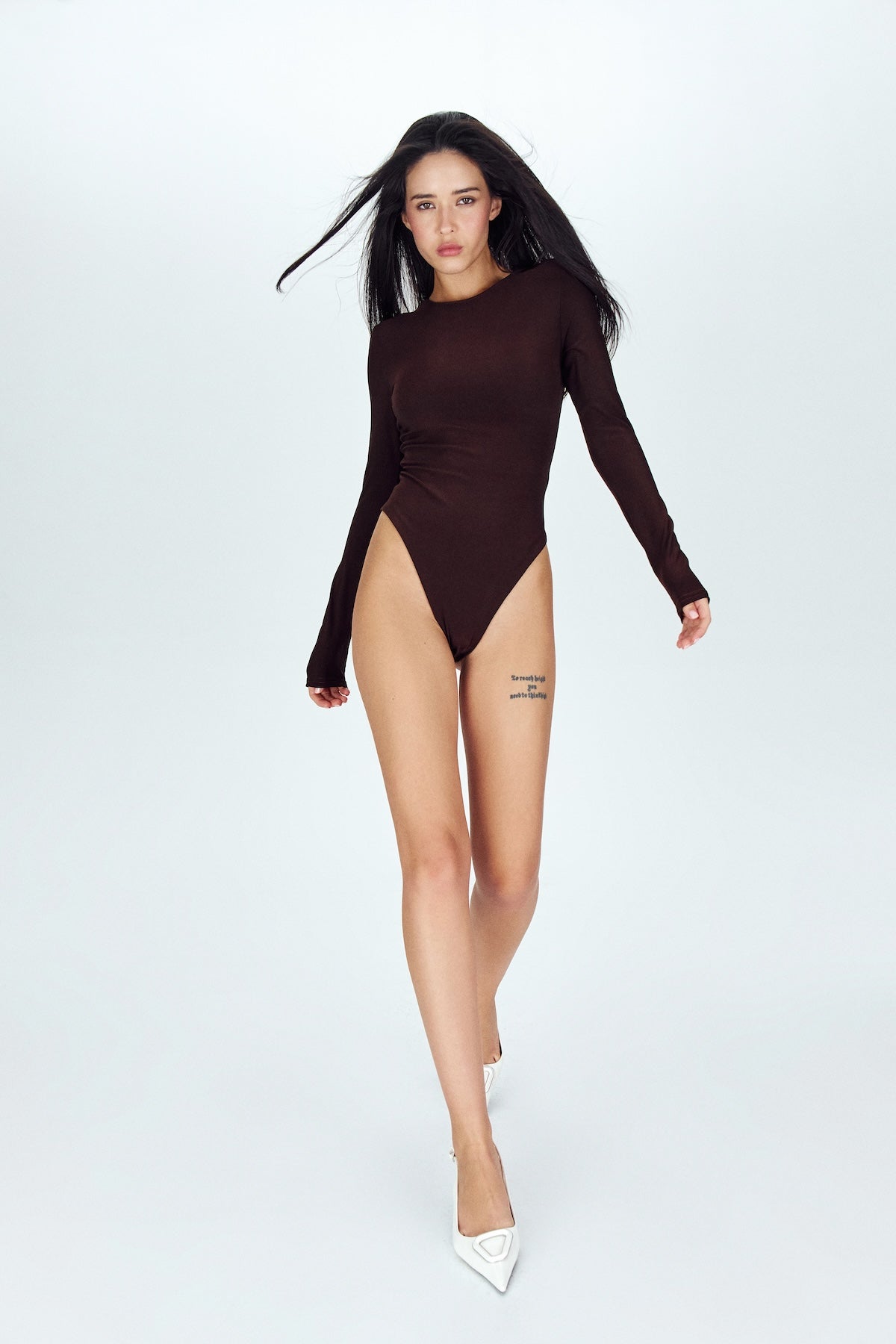 Minimalist basic bodysuit with a round neckline and long sleeves — an essential piece in any wardrobe. Made from elastic knit fabric, it fits comfortably, following the body’s natural lines. Thanks to its clean design, the bodysuit pairs effortlessly with tailored blazers and trousers, as well as with casual jeans or sporty looks.