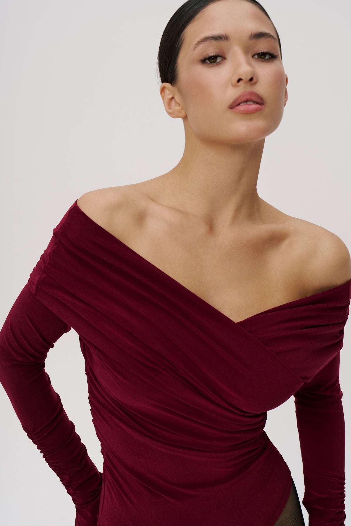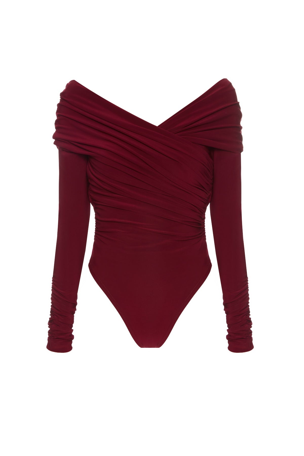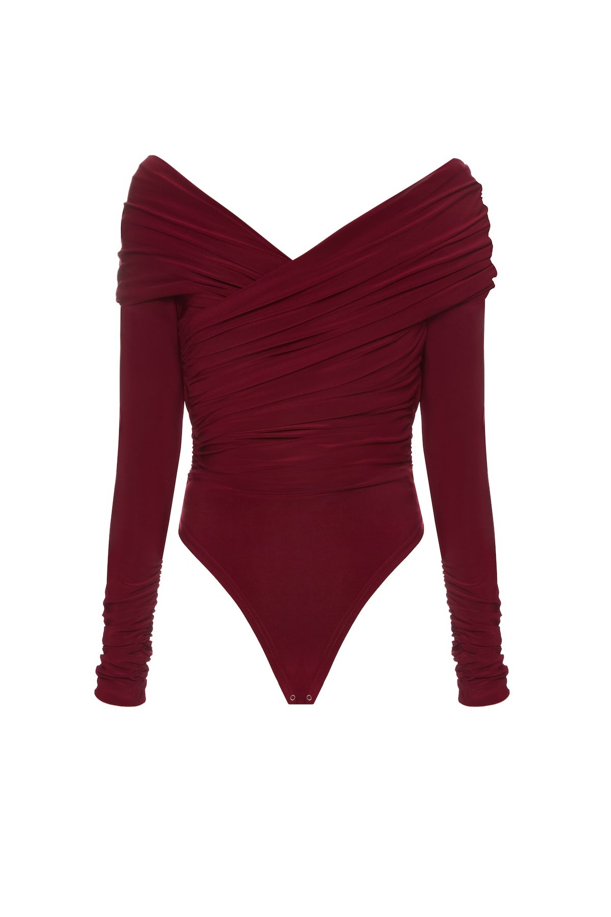 The wrap bodysuit with ruching is the epitome of femininity and style. Its refined cut and delicate gathers beautifully accentuate the silhouette, adding a touch of elegance. Long sleeves with soft ruching create a subtle volume, enhancing the uniqueness of the design. A convenient snap closure ensures comfort and ease of wear.