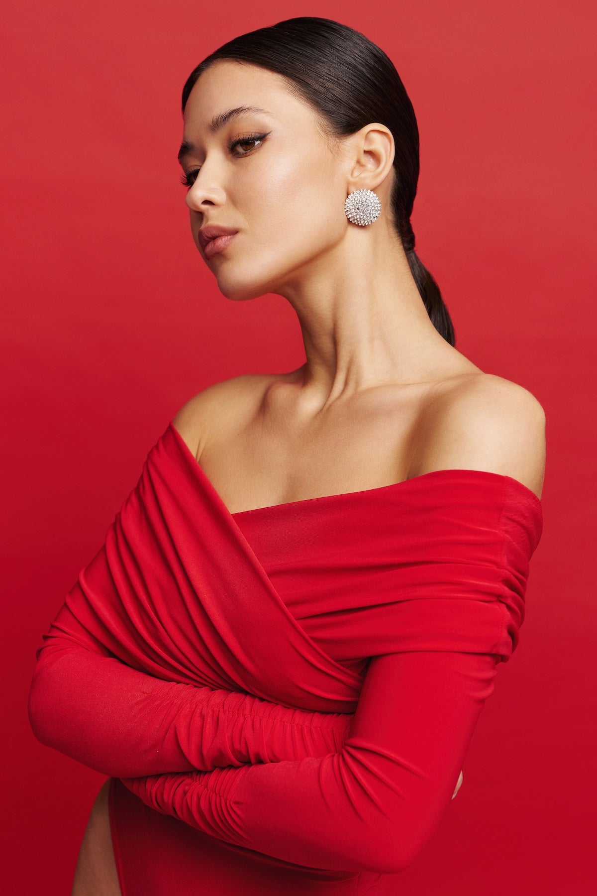 The wrap bodysuit with ruching is the epitome of femininity and style. Its refined cut and delicate gathers beautifully accentuate the silhouette, adding a touch of elegance. Long sleeves with soft ruching create a subtle volume, enhancing the uniqueness of the design. A convenient snap closure ensures comfort and ease of wear.