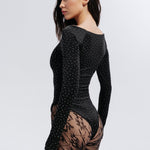 Elegant bodysuit with rhinestones and a round neckline that creates a delicate focus on the décolleté. Its subtle sparkle adds a touch of luxury while maintaining a minimalist silhouette. Made with a double layer of fabric, it holds its shape perfectly and is not see-through.