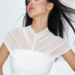 The base is made of semi-sheer mesh with a soft knit lining, ensuring comfort and opacity. The upper part is adorned with draped mesh, creating a sense of lightness, while the additional shoulder detail, attached to the base, forms a refined and contemporary silhouette.