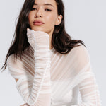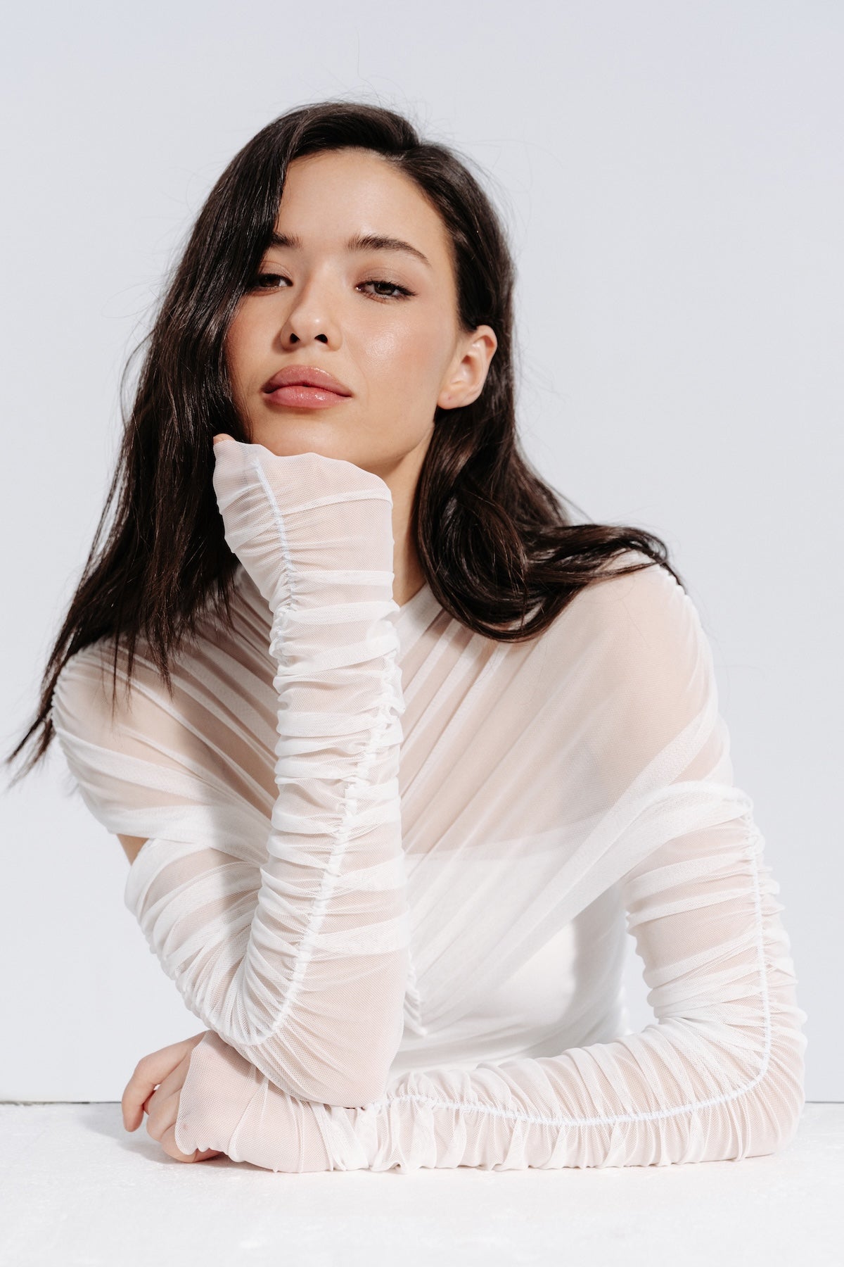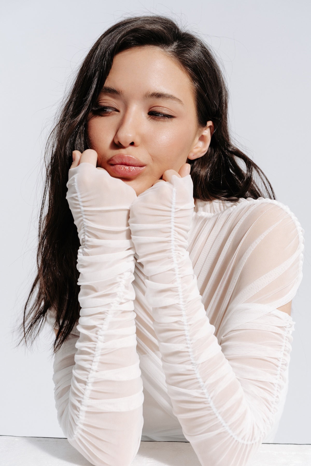 Semi-sheer sleeves with delicate ruching — a standout accent piece you can add to your favorite bodysuit. Light, airy, and flexible, they create an elegant silhouette and add volume and femininity to your look.