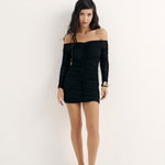 Mini off-shoulder dress with long sleeves, fully draped to create a refined silhouette. The sheer mesh overlay adds lightness, while the inner knit lining ensures comfort and opacity. An ideal choice for festive occasions and evening outings when you want to highlight femininity and elegance.