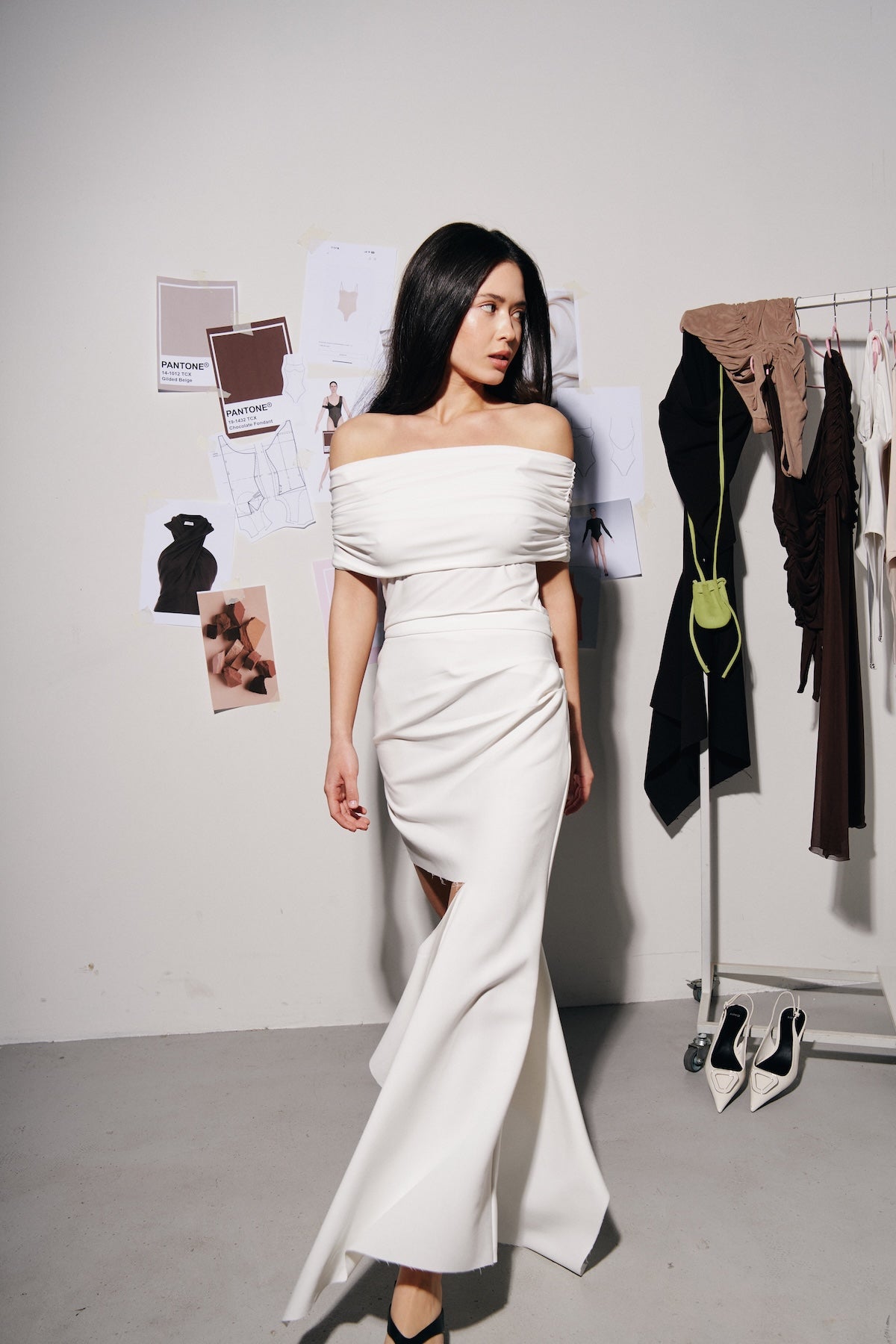 A refined high slit elongates the legs, while delicate draping adds movement and fluidity.