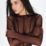 Bodysuit made of sheer fabric, adorned with vertical inserts that visually elongate the silhouette.