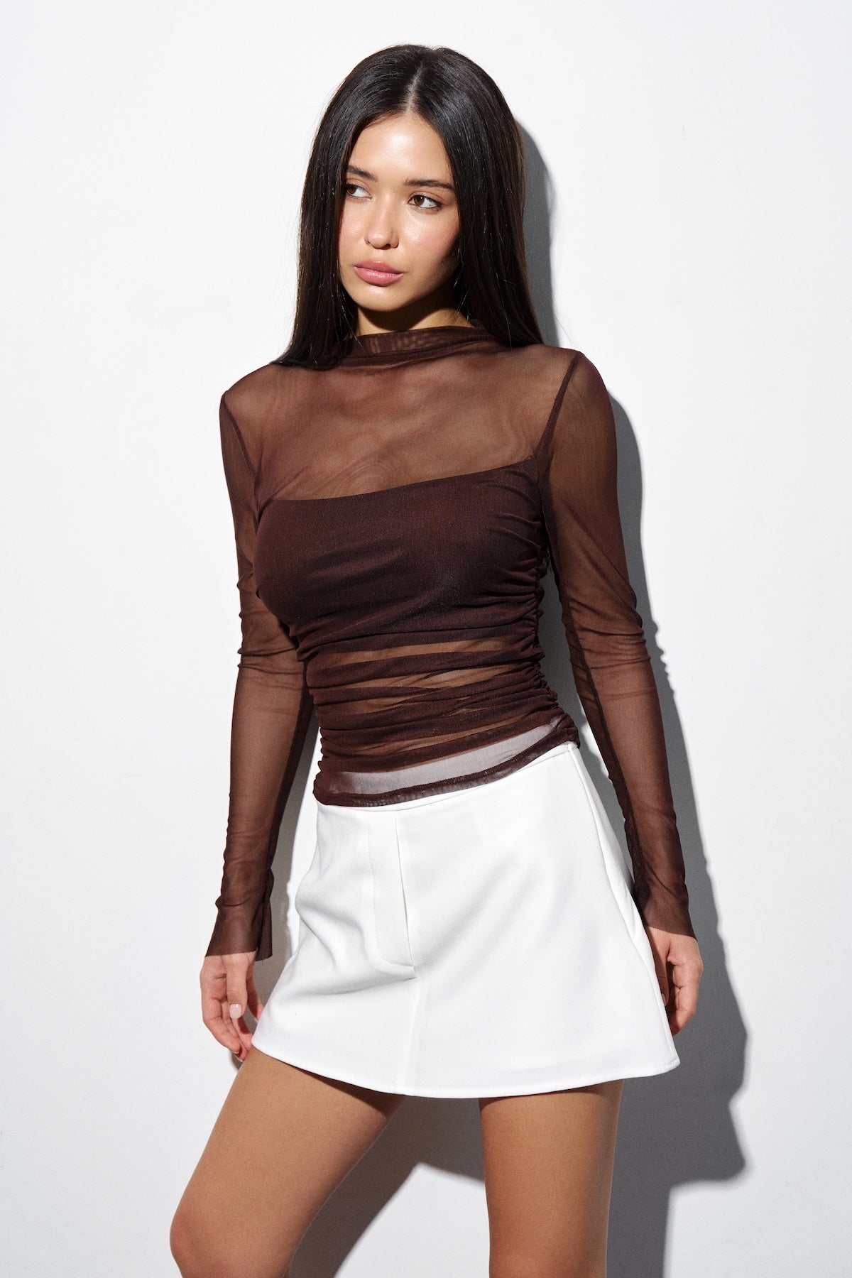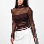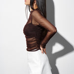 Sheer top with ruching in Chocolate