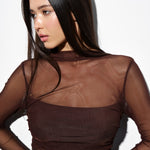 Striking sheer top made of soft, stretchy mesh that comfortably hugs the body and highlights the silhouette. The long sleeves and high neckline balance the transparency, creating an elegant harmony between minimalism and boldness. A distinctive feature of this piece is the built-in short knit top, allowing it to be worn without a bra while maintaining comfort and confidence in any look.
