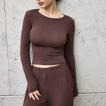 The perfect basic top for effortless comfort. Made from soft knit fabric, it feels gentle on the skin and allows for easy movement. The fitted silhouette beautifully accentuates the figure, while the long sleeves add extra coziness. This long-sleeve top pairs perfectly with lounge pants, sporty sets, or casual city looks.