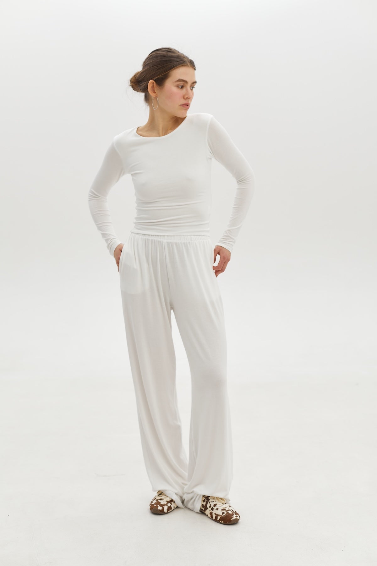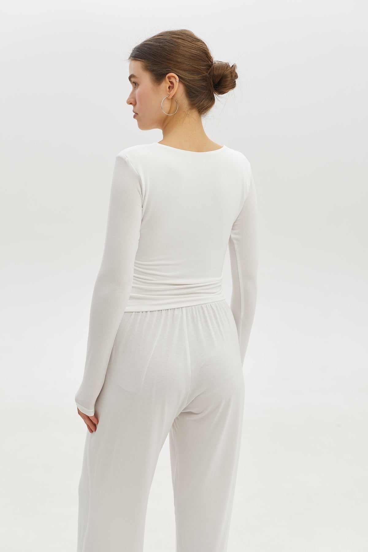 The perfect basic top for effortless comfort. Made from soft knit fabric, it feels gentle on the skin and allows for easy movement. The fitted silhouette beautifully accentuates the figure, while the long sleeves add extra coziness. This long-sleeve top pairs perfectly with lounge pants, sporty sets, or casual city looks.