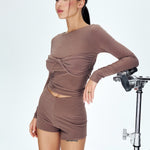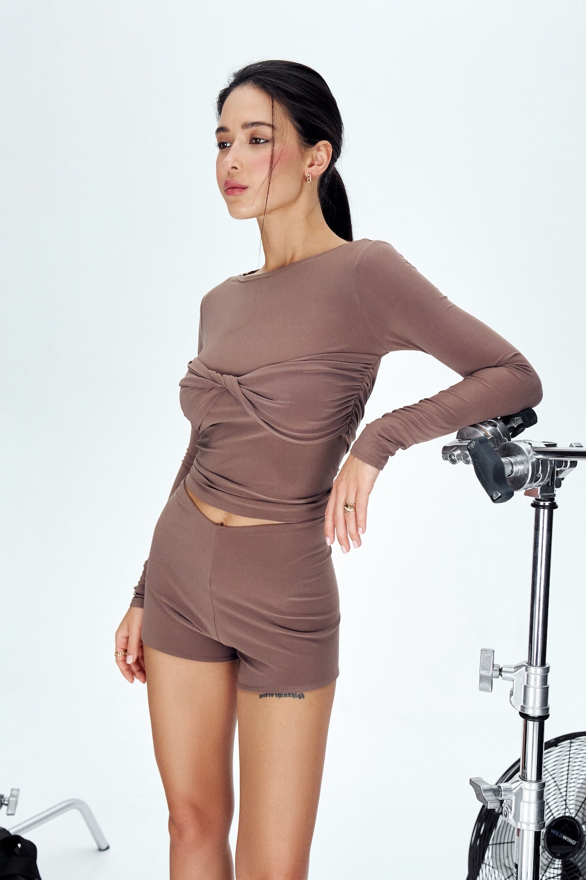 A top made from soft, stretchy fabric that fits comfortably against the body. The striking draping at the bust adds a modern touch, while the long sleeves make it perfect for cooler evenings.