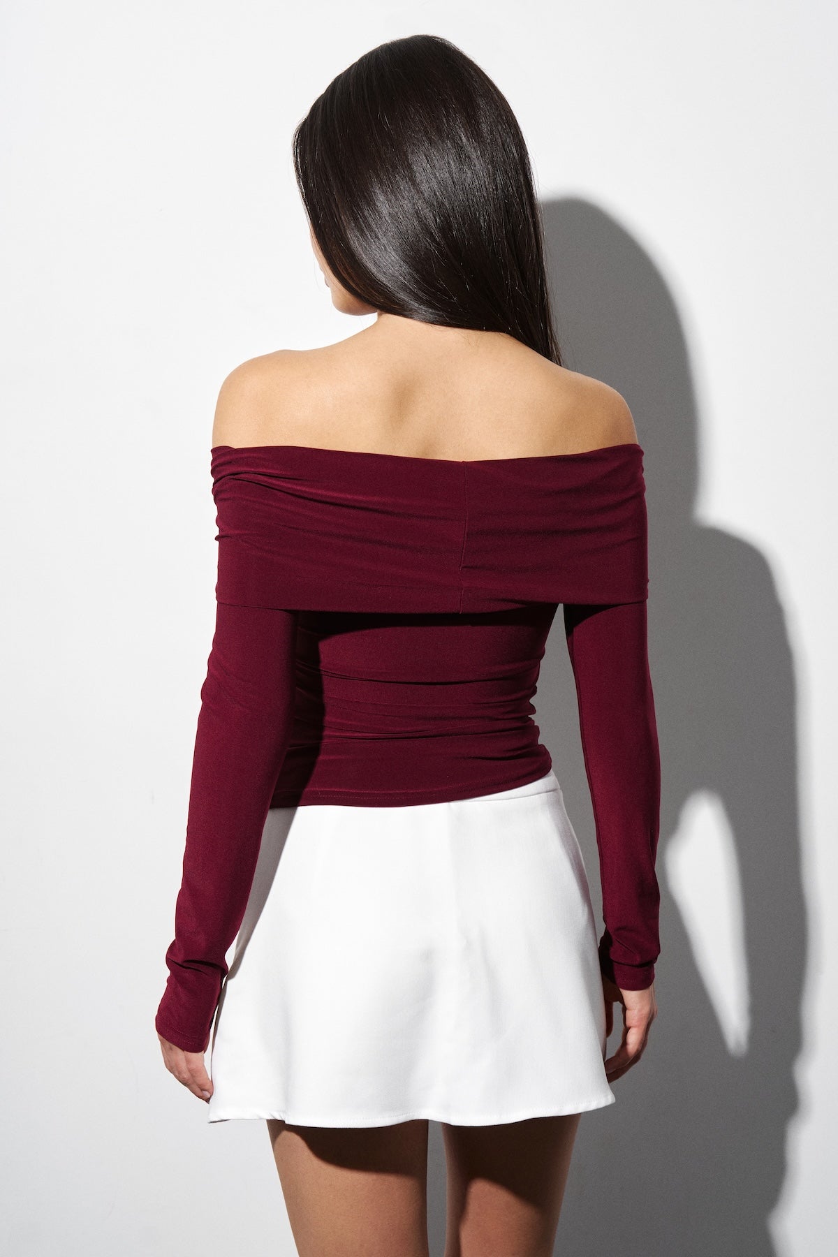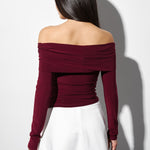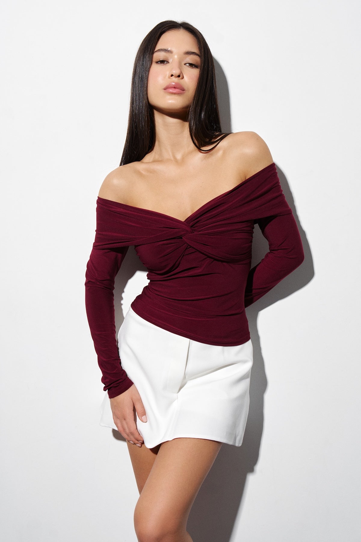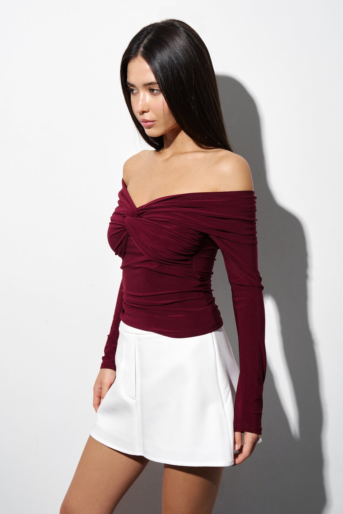 Feminine top with a knot and elegant draping. The design reveals the shoulders, accentuating the décolleté and visually elongating the neck. Made from soft knit fabric that feels pleasant against the skin, is non-transparent, and ensures all-day comfort. A perfect choice for both an evening look and a stylish daytime outfit.