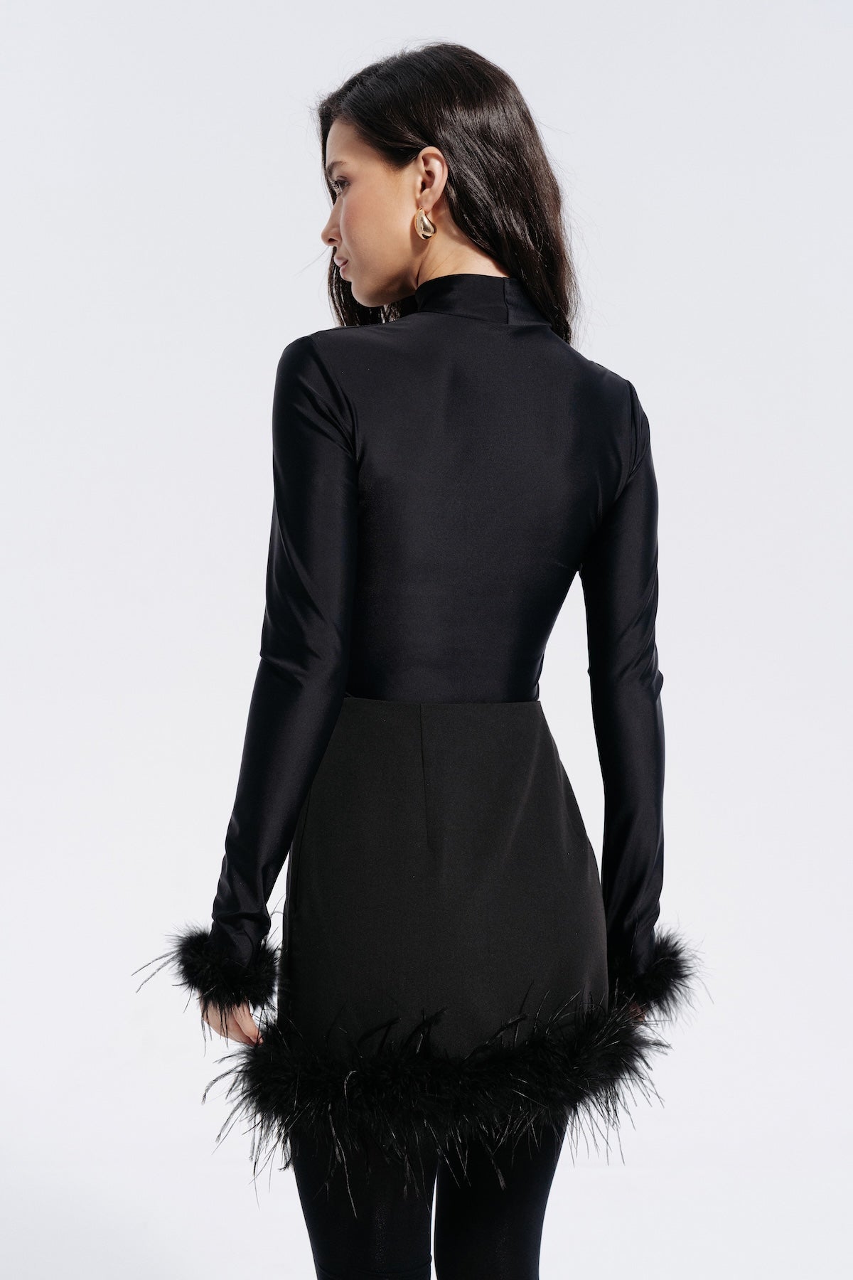 An impressive black top. The high neckline creates an elegant silhouette, while the feather sleeves add drama and draw attention to movement. Perfect for striking evening outings.