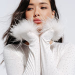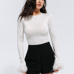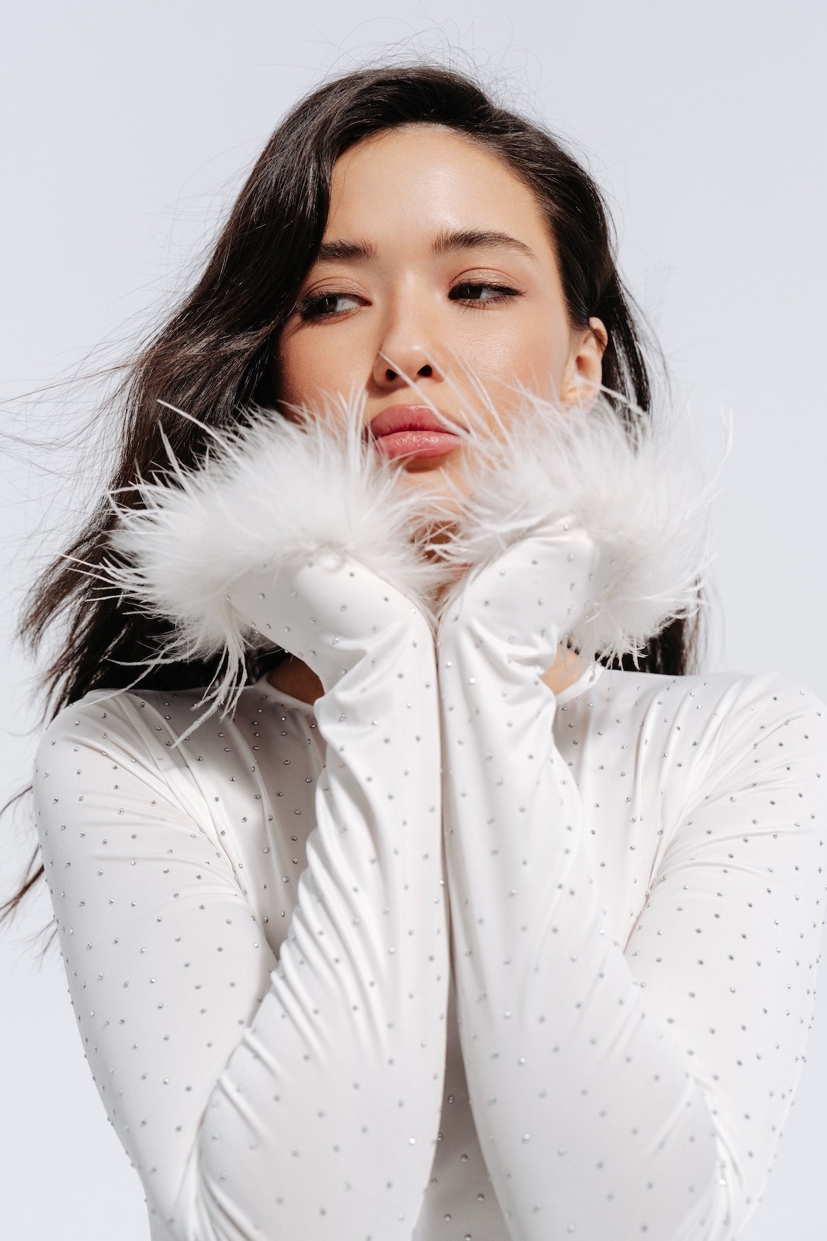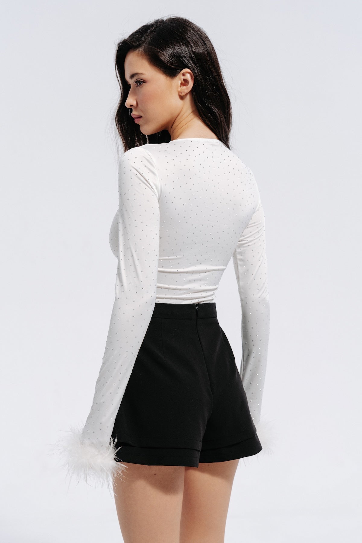 A striking top richly adorned with rhinestones that create a delicate shimmer with every movement. Sleeves decorated with feathers add drama and evening sophistication to the look. An ideal choice for festive outings, events, and evenings when you want to highlight your femininity and individuality.