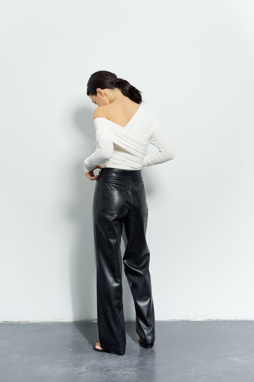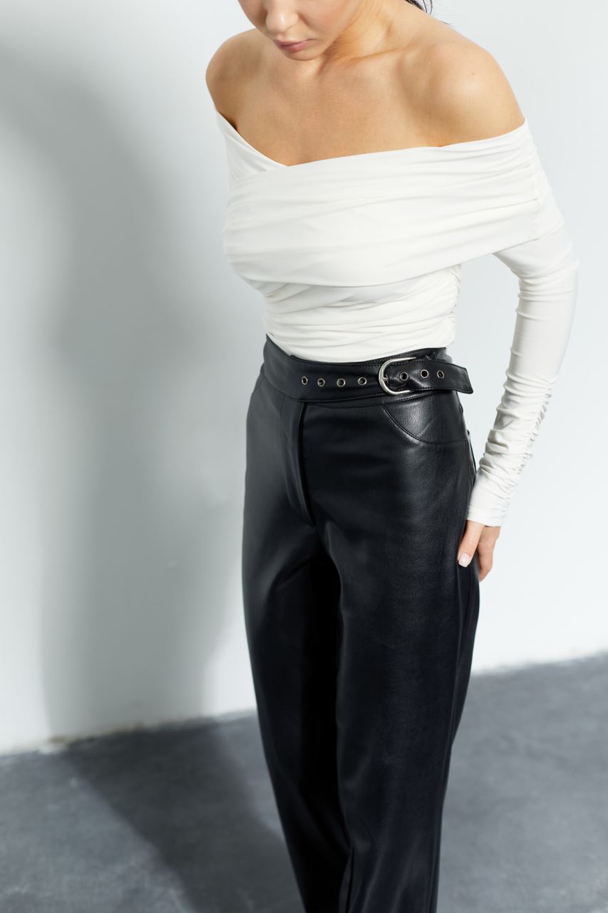Штани з високою посадкою та акцентованим поясом спереду. Застібається на ґудзик та блискавку спереду