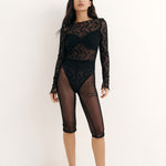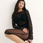 Елегантне боді з ніжного мережива, що поєднує закритий базовий фасон спереду та відкриту спинку. Спинка з круглим вирізом на всю довжину, застібається на ґудзик для зручності. Довгі рукави додають образу витонченості, а вшитий топ всередині забезпечує комфорт і непрозорість. Ідеальний вибір для поєднання жіночності та делікатної сексуальності.