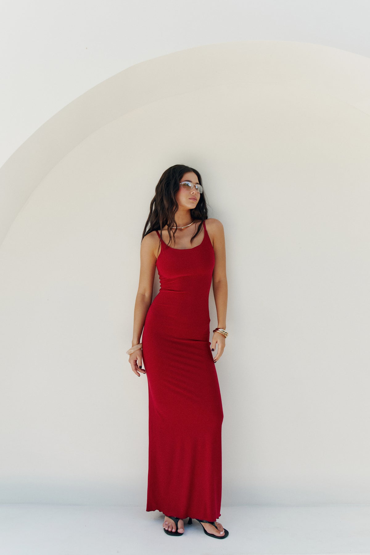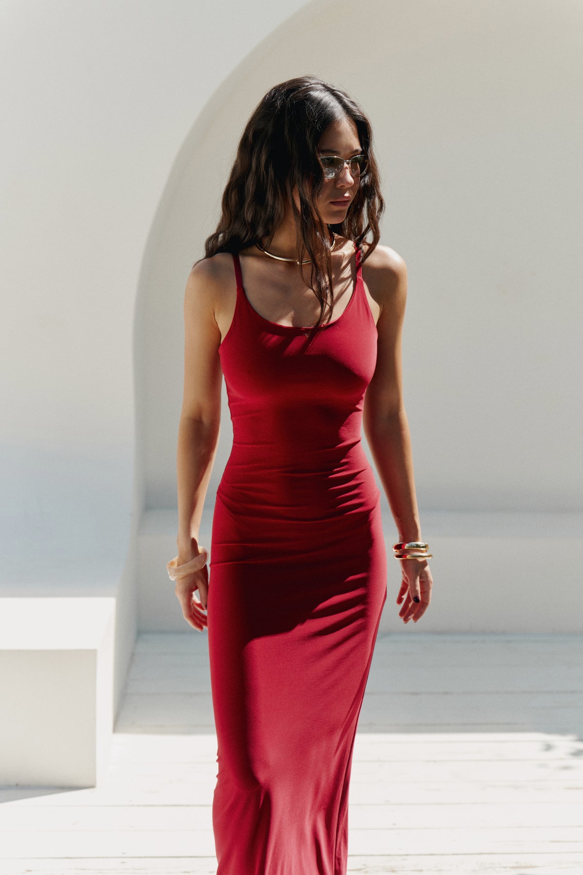 Сукня максі облягаючого силуету — ідеальний вибір для тих, хто цінує комфорт і елегантність. Має витончений квадратний виріз декольте та тонкі бретелі, що підкреслюють шию і плечі. Поділ сукні досить широкий для свободи рухів і зручності при ходьбі, поєднуючи стильний вигляд з практичністю.