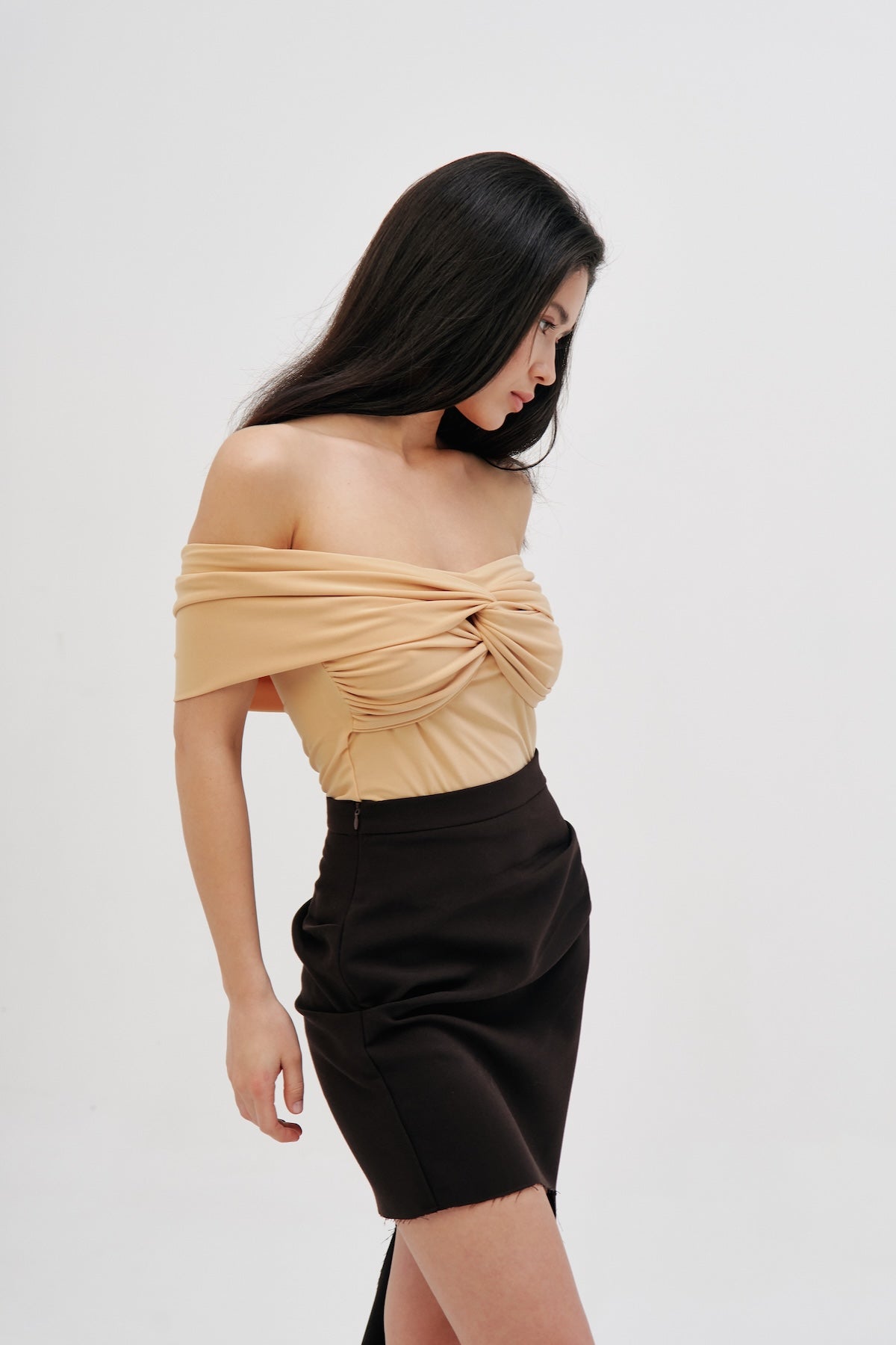 Витончений високий розріз підкреслює довжину ніг, а драпірування додає пластичності.