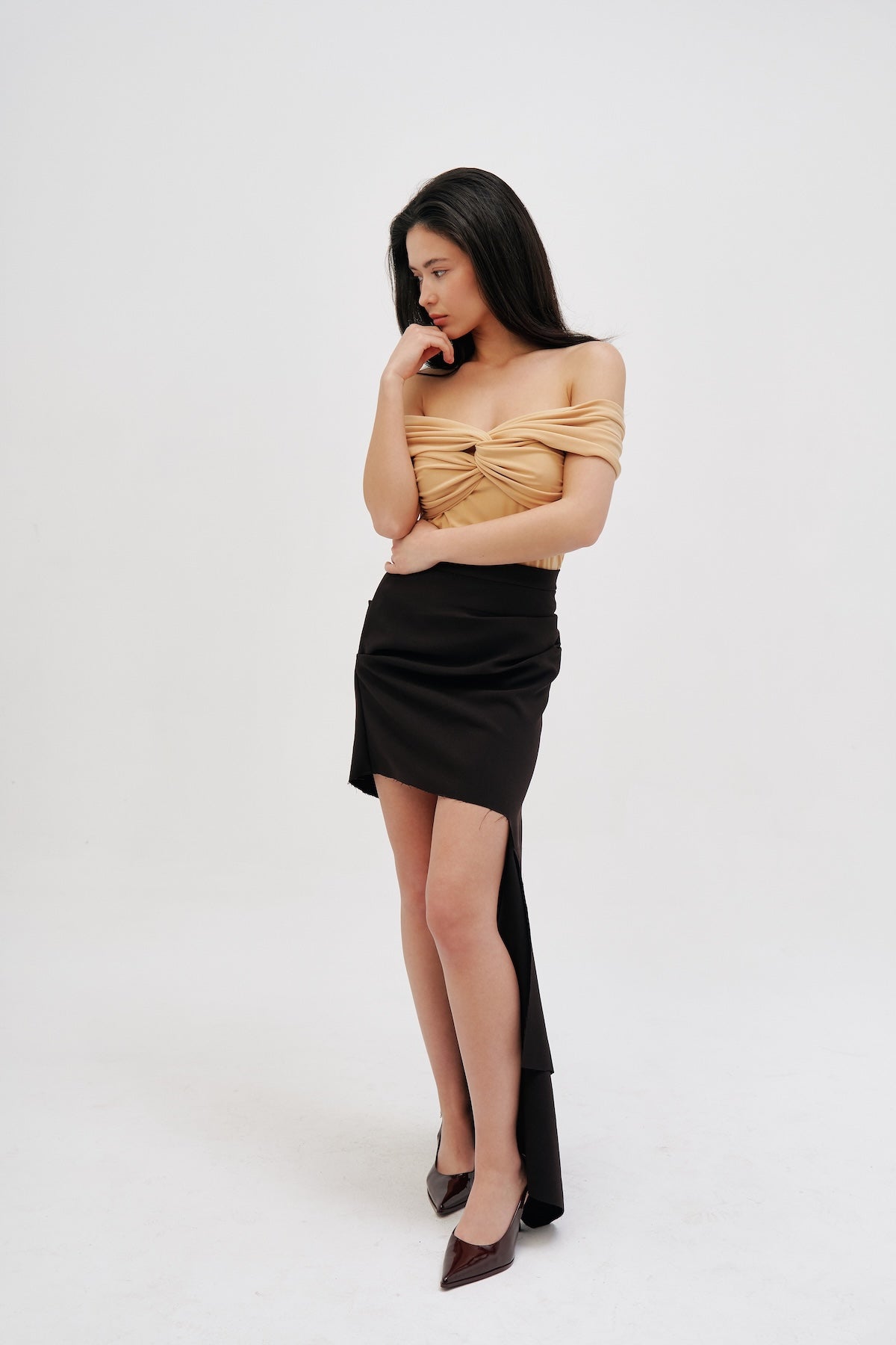 Ідеальна для модних івентів, вечірніх виходів чи зйомок. Смілива та архітектурна модель, яка точно не залишиться непоміченою. Спідниця виготовлена з щільної костюмної тканини, має асиметричну форму з акцентним шлейфом, який наче навмисно зрізаний. Всі краї — як основний низ, так і край шлейфу — залишені без обробки, створюючи ефект «raw edge» для ще більш виразного вигляду.