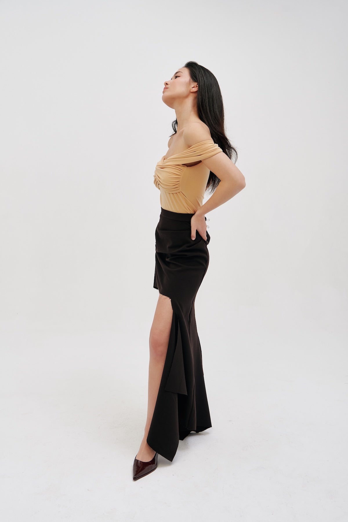 Структурна спідниця з акцентом на необроблений зріз — це універсальна модель, яка працює як у парі з базовими топами, так і з акцентними боді.Довгий шлейф додає драматичності, а розріз робить образ більш відкритим та сміливим.
